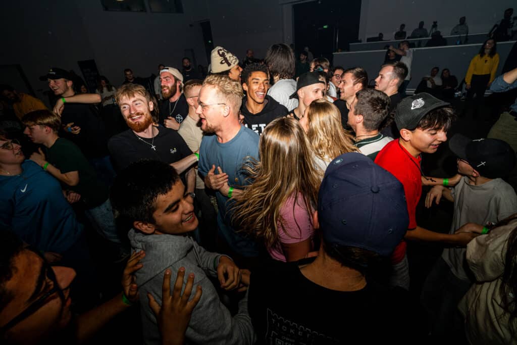 Lichter flackern, der Beat pulsiert, Besucher springen. Unermüdlich feuern die Musiker auf der Bühne den Zuhörern Wortsilben entgegen. Die Besucher erwidern mit euphorischen „Yeah“, „Aaaahh“ und „Jo“-Rufen. Köpfe nicken im Takt. Inmitten der sich rhythmisch bewegenden Menge gestikuliert ein etwa 20 Jahre alter junger Mann wild mit den Armen – das Zeichen für Moshpit. Sofort beginnen Einzelne, mit ausgebreiteten Armen Platz zu schaffen. Ein kleiner Freiraum in der Mitte der Kirche entsteht und formt sich zu einem beachtlichen Kreis. Übermütige Teenager stürmen von einer Seite der runden Fläche zur anderen. Aus einer anderen Ecke ruft eine junge Frau: „Jesus is King“. Der Bass setzt ein. Es gibt kein Halten mehr. Um die 40 Personen rasen aufeinander zu und treffen sich in der Mitte des nun nicht mehr vorhandenen Kreises. Der freie Raum wird ersetzt durch springende Jugendliche, Schweiß und Euphorie – „OneLoveJam 2025“ – das größte Gospelrap-Festival Deutschlands.