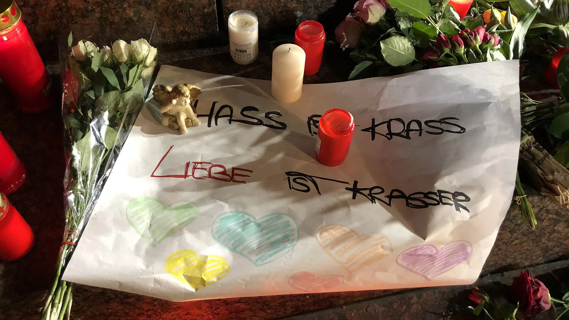 Um 20 Uhr haben die meisten Menschen den Marktplatz verlassen. Manche bleiben noch stehen vor dem Grimm-Denkmal, auf dem sich Kerzen, Karten und Blumen türmen. Dann machen sie sich auf den Nachhauseweg. Es muss ja weitergehen.