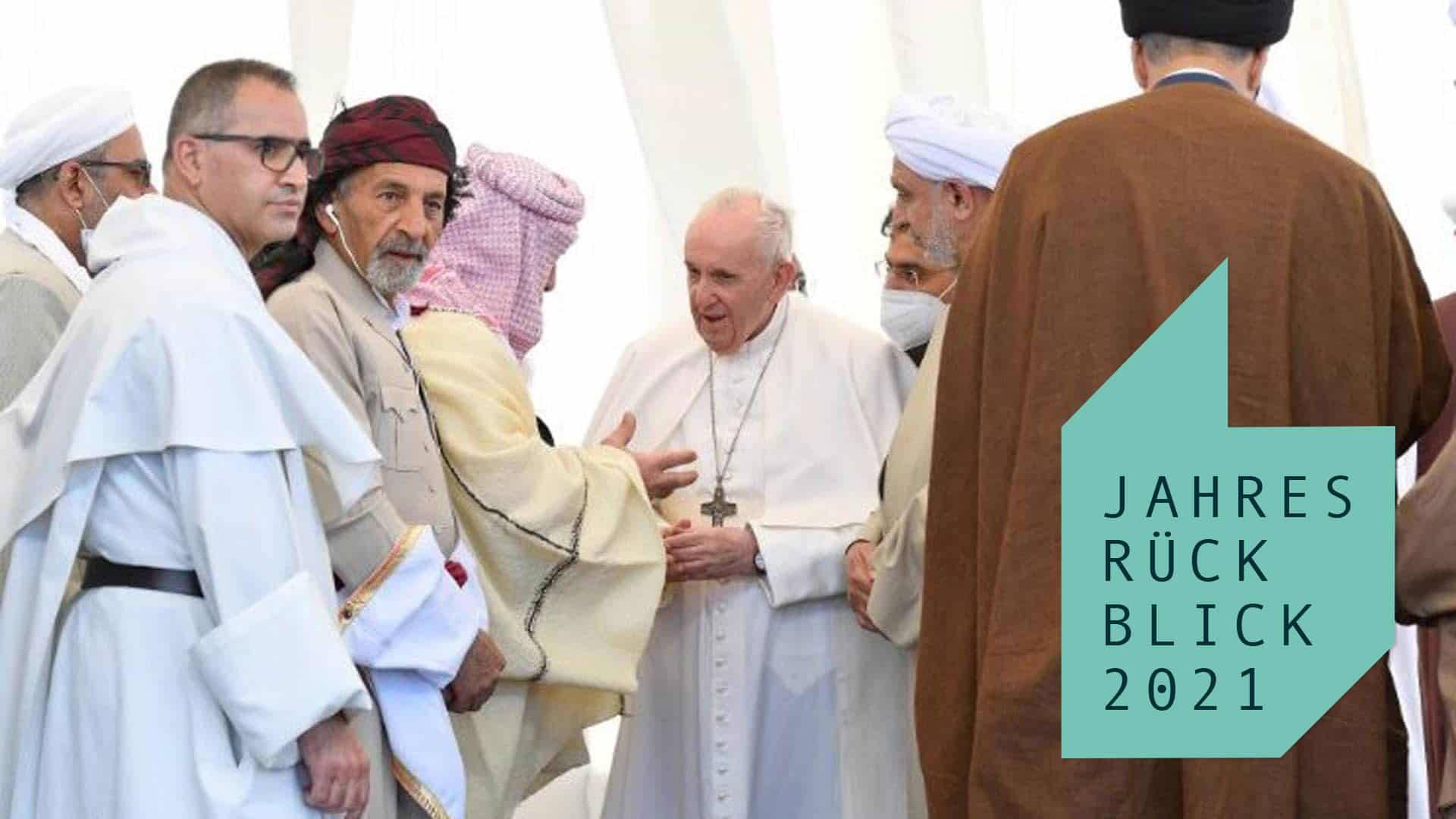 Papst Franziskus reiste Anfang März in den Irak und besuchte dort unter anderem christliche Gemeinden. Er traf außerdem muslimische Geistliche und Iraks Präsidenten Barham Salih und Premierminister Mustafa al-Kadhimi. Die Christen im Land rief das Oberhaupt der katholischen Kirche dazu auf, sich für Frieden und Versöhnung im Land einzusetzen. Es war der erste Besuch eines Papstes im Irak überhaupt und die Reise wurde als historisches Ereignis angesehen. Weniger als drei Prozent der Iraker sind Christen. Es war die erste Auslandsreise von Papst Franziskus seit 15 Monaten.