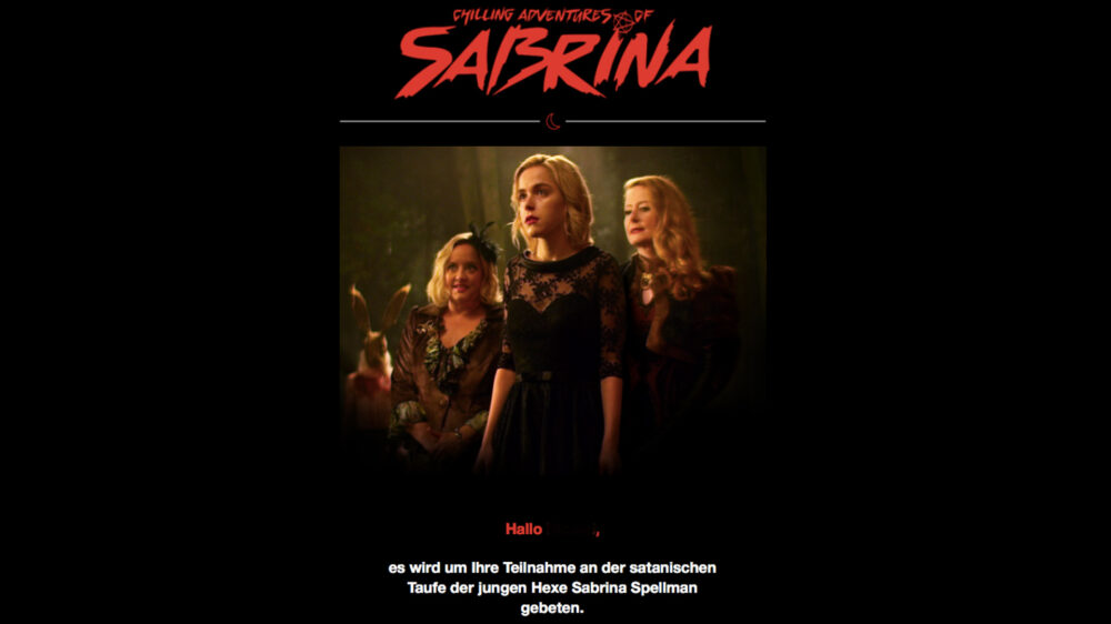 In dieser Woche gingen die ersten zehn Folgen der Netflix-Serie „Chilling Adventures of Sabrina“ (Schaurige Abenteuer von Sabrina) auf der Streaming-Plattform an den Start. Rechtzeitig ein paar Tage vor dem 31. Oktober, an dem Freunde des Grusels Halloween feiern, verschickte das Marketing von Netflix eine Einladungsmail an seine Kunden: „Es wird um Ihre Teilnahme an der satanischen Taufe der jungen Hexe Sabrina Spellman gebeten … Seien Sie Zeuge, wenn Sabrina ihren Namen in das Buch der Bestie einträgt und ihren Weg auf dem Pfad der Dunkelheit beginnt …“ Unterzeichnet von Hilda und Zelda Spellman, den Tanten von Sabrina, also Figuren der Serie.