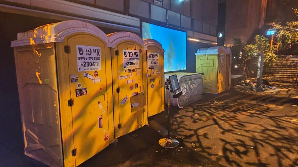 Auf der anderen Seite der Halle befinden sich durchlöcherte gelbe Dixitoiletten, in denen sich Festival-Teilnehmer vor den Terroristen verstecken wollten – ohne Erfolg. Ein Video zeigt, wie ein Mann mit seinem Gewehr auf die Toiletten schießt.
