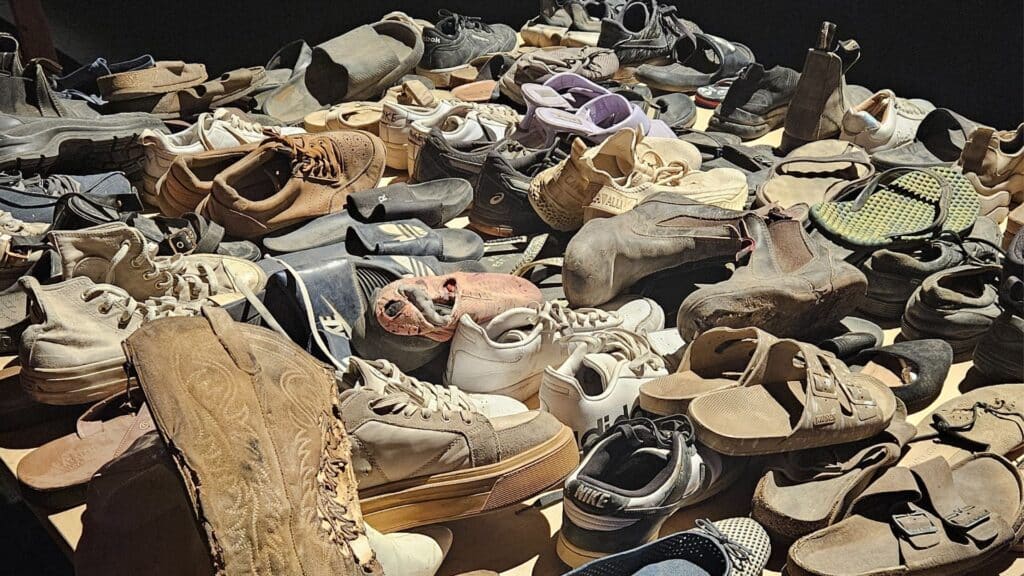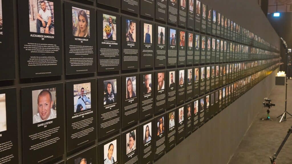 Und die Ausstellung zeigt die Opfer. Im hinteren Teil der Abflughalle sind an einer Wand Bilder aller ermordeten Festival-Teilnehmer aufgehängt. Auf der gegenüberliegenden Seite befinden sich Bilder von den Teilnehmern, die von der Hamas in den Gazastreifen verschleppt worden. Dazwischen ein Meer aus Lichtern und Tische, auf denen zurückgelassenen Kleidungsstücke und Schuhe gestapelt sind. Erinnerungen an Schuhhaufen aus den Konzentrationslagern der Nationalsozialisten werden geweckt.