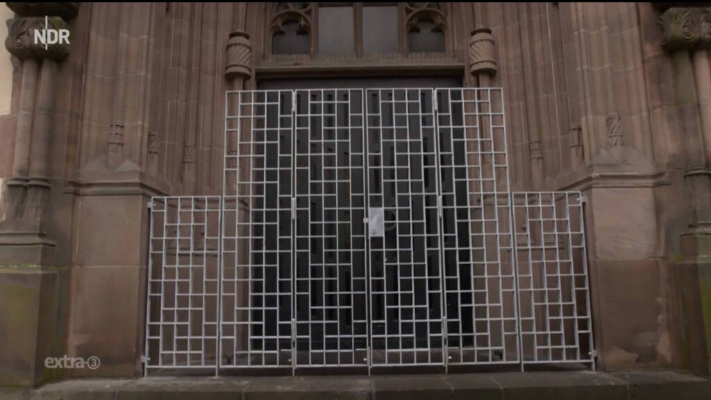 Eine Kirche in Düsseldorf ist Ziel des ätzenden Spottes der Satiresendung „extra 3“. Weil offenbar ein Obdachloser im Eingangsbereich störte, errichtete die Gemeinde ein abschreckendes Stahltor.